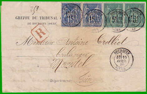: 15 c. Cette lettre du tribunal civil de Bourgoin a été posté le 16 avril 1880, en recommandé. Elle porte la griffe " R", frappée à l'encre rouge qui sera en usage jusqu'au 15 mars 1895. |