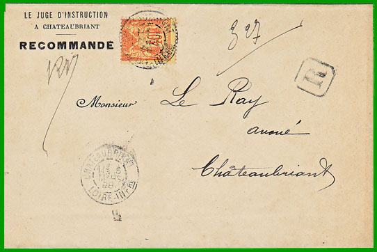 : 15 c. Cette lettre du juge d'instruction de Châteaubriant a été posté le 5 mars 1898, en recommandé. La lettre porte la mention "RECOMMANDÉ", imprimée à l'encre noire, qui ne sera autorisée officiellement qu'à partir de mai 1899. |