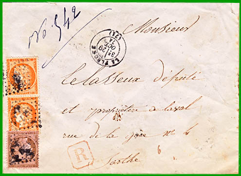 La loi du 20 mai 1854 et la circulaire N° 12 applicable le 1er juillet 1854 ont supprimé la recommandation en l’assimilant à la lettre chargée. Les tarifs d’affranchissement sont donc identiques. A partir de cette date voir la page "Lettres chargées".