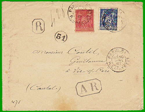 : 30 c. Cette lettre recommandée avec demande d'accusé de réception a été postée à Paris le 30 avril 1897. |