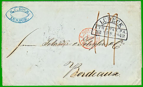 Taxe territoriale de 1,00 F + 40 c.Cette lettre, postée à Lübeck le 23 avril 1849, a transité par Hamburg le 24 avril. Elle est entrée en France le 26 avril : cachet à date rouge "