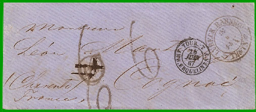 TOUR.-T AMB. ERQUELINES F". Elle est arrivée à Cognac le 27 juin 1867 où le destinataire a payé la taxe de 6 décimes, matérialisée par le tampon 6.
