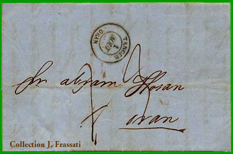 A partir du 1er janvier 1860, jusqu'au 15 juillet 1869, application d'une taxe fixe de 5 centimes à l'entrée en France, sur les lettres correctement affranchies. |