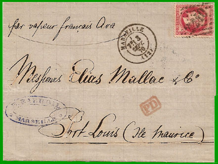 janvier 1866 Affranchissement à 80 c. Cette lettre a été postée le 3 septembre 1870 à Marseille, où elle a embarqué le 4 sur le paquebot "Ava" de la ligne N (Marseille à Hong-Kong) jusqu'à l'escale d'Aden. Puis elle a été acheminée le 17 septembre par le paquebot "Danube" de la ligne T (Aden à La Réunion et Maurice). Elle est arrivée à Port-Louis le 1er octobre 1870. |