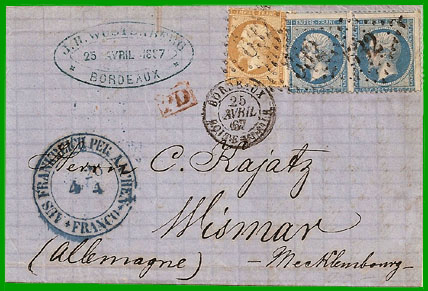 Affranchissement à 50 c.Cette lettre, postée à Bordeaux le 25 avril 1867, a transité par Aachen (Aix-la-Chapelle, en Prusse) le 26 avril