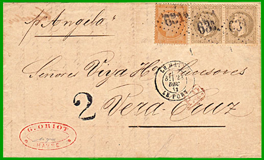 1er juillet 1871 Affranchissement à 1,00 F + Taxe 2 reales Cette lettre, postée au Havre le 23 décembre 1872, a été acheminé jusqu'à Vera-Cruz par le bâtiment du commerce "Angela". Le destinataire a payé la taxe de 2 reales (1/2 à 3/4 onza) pour le port intérieur mexicain (taxe tampon 2). |