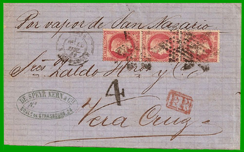 20 décembre 1856 Affranchissement à 50 centavos + Taxe 12 décimes Cette lettre, postée à Mexico, a été acheminée jusqu'à Vera-Cruz "por extraordinario" à plus de 17 lieues. Pesant moins de 1/2 onza, elle a été affranchie à 50 centavos. Elle est entrée en France le 1er octobre 1871, où le destinataire a payé la taxe de 12 décimes. |
