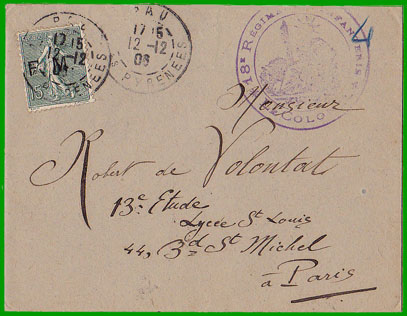 Tarif du 16 avril 1906 Affranchissement à 10 c. Cette lettre a été postée par un militaire à la boîte mobile du paquebots-poste "Magellan" des Messageries Maritimes, à l'escale de Rio de Janeiro. Elle a reçu le cachet à date "BUENOS-AYRES A BORDEAUX 1° L.J. N°1" du 7 décembre 1909. Elle est arrivée à Bordeaux le 25 décembre 1909. |