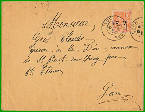Tarif du 23 mars 1901 Franchise Militaire à 15 c. Cette lettre, expédiée par un militaire en garnison à Lyon, a été affranchie avec le premier timbre de franchise militaire instauré par le décret du 23 mars 1901. Elle a transité par St-Etienne le 26 avril 1903. Jusqu'en 1946, les timbres de franchise militaire, sont des timbres-poste ordinaires surchargés F. M. |