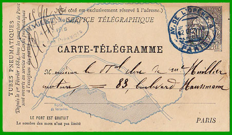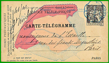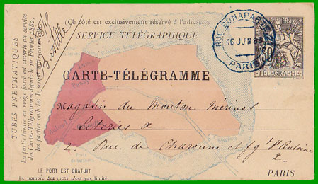 A partir du 1er mai 1879, la taxe des dépêches confiées à l'Administration des télégraphes et destinées à être échangées dans les limites de l'ancien octroi de Paris est indépendante du nombre de mots. Les dépêches doivent être libellées sur des formules affranchies et sont transportées par la voie des tubes pneumatiques.