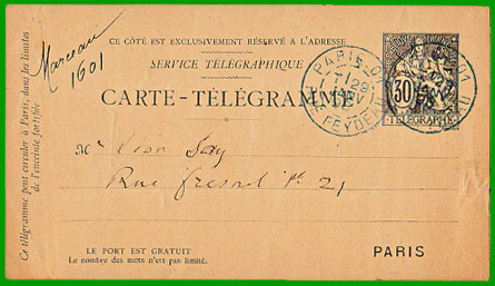 Affranchissement à 30 c.Cette carte-télégramme a été expédiée par pneumatique à "Paris Rue Feydeau" le 29 janvier 1896, à destination de la Rue Fresnel.