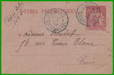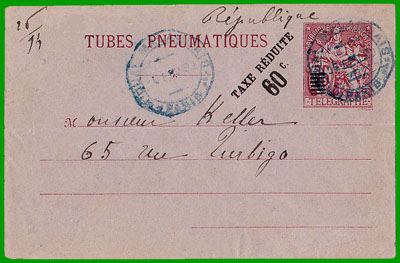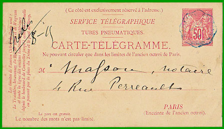 Affranchissement à 50 c.Ce type de carte-télégramme est le premier expédié par tubes pneumatiques.