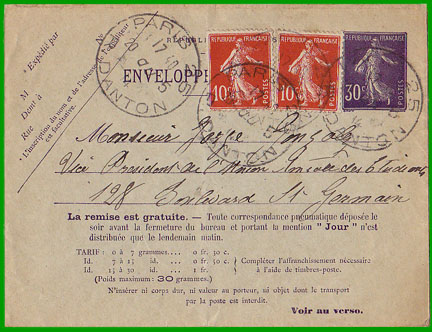 janvier 1902 Affranchissement à 50 c. Cette enveloppe-pneumatique à 30 centimes, affranchie avec un complément de 20 centimes en timbres-poste, a été postée à "Paris R. Danton" le 20 mai 1914, à destination du Boulevard St-Germain. |