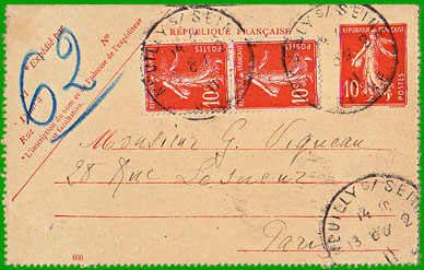 juillet 1898 Affranchissement à 10 c. + 20 c. Cette carte-lettre à 10 centimes a reçu un complément d'affranchissement de 20 centimes pour être acheminée par pneumatique. Elle a été postée à Neuilly s/ Seine le 13 octobre 1911, d'où elle a été acheminée par un jeune facteur-bouliste cycliste au bureau de poste de l'Étoile (n° 62). |