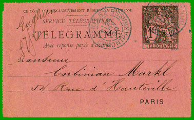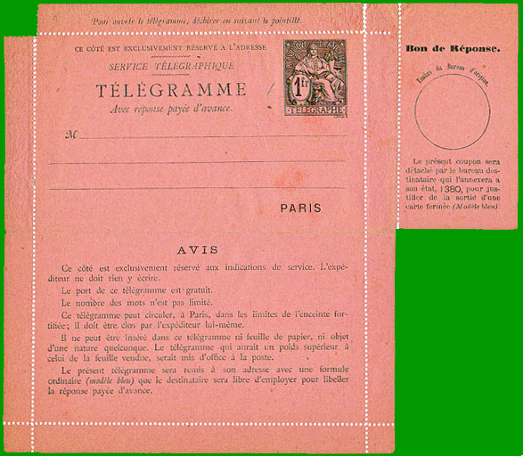 TÉLÉGRAMME FERMÉ AVEC RÉPONSE PAYÉE D'AVANCE