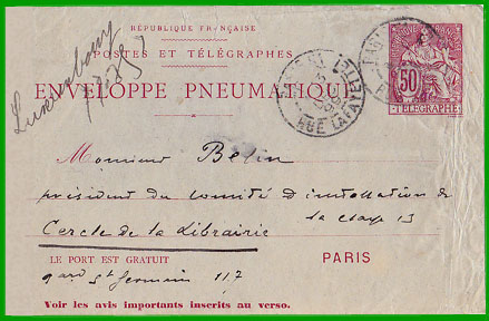 Tarif de novembre 1896 Affranchissement à 50 c. Cette enveloppe pneumatique a été postée à "Paris Rue Lafayette" le 13 décembre 1899, à destination du Boulevard St Germain. |
