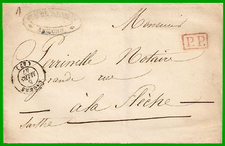 janvier 1828 Affranchissement à 30 c. Cette lettre a été postée à Angers le 5 mars 1847, à destination de La Flèche, distante de 45 km en ligne droite. L'expéditeur a payé l'affranchissement de 30 centimes, inscrit à la plume au verso. L'agent des postes a apposé la griffe rouge P.P. pour attester de ce paiement. |