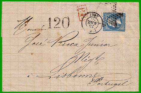 Affranchissement à 20 c. + Taxe 120 reisCette lettre, postée à Paris le 25 avril 1865, a transité par l'Espagne. Elle est arrivée le 30 avril 1865 à Lisbonne, où le destinataire a payé la taxe de 120 reis .
