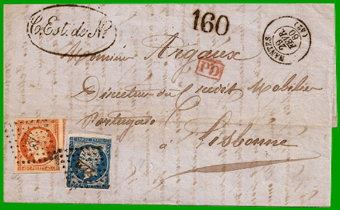 A partir du 1er août 1849, les lettres empruntant la voie des bâtiments du commerce reliant un port français à un port portugais doivent obligatoirement être affranchies jusqu'au port de débarquement.