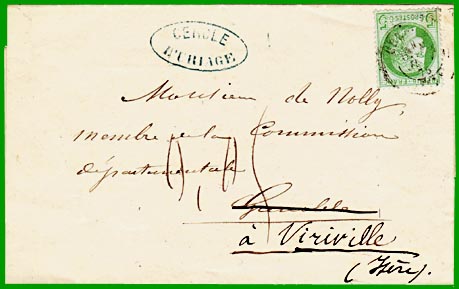 août 1856 Affranchissement à 5 c. Cette lettre a été postée à Uriage le 15 juin 1875, à destination de Grenoble, dans la même circonscription. Elle a été réexpédiée à Viriville, dans une autre circonscription, où elle est arrivée le 16 juin 1875. Le destinataire n'a donc payé que la différence entre l'affranchissement territorial de 10 centimes qui est dû pour la deuxième destination et l'affranchissement local de 5 centimes apposé sur l'imprimé. Soit 5 centimes, matérialisés par la taxe manuscrite 0,05. Remarquez que malgré l'instruction du 25 août 1856, la nouvelle adresse a été inscrite à l'encre noire. |