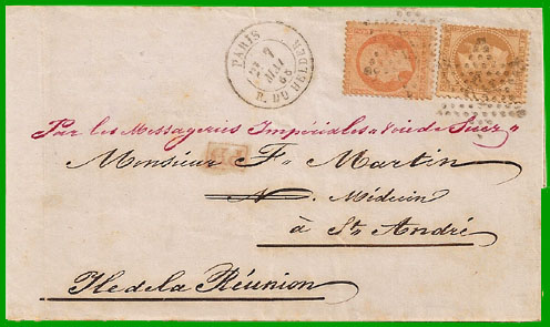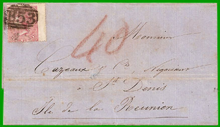 Tarif du 24 décembre 1860 Affranchissement à 4 pence + Taxe 40 centimes Cette lettre de l'Ile Maurice, postée le 12 janvier 1861, a été affranchie à 4 pence qui ne couvraient que le port intérieur. Elle a embarqué sur un bateau de commerce reliant Maurice à St-Denis de La Réunion où elle est arrivée le 14 janvier. Elle a été taxée au tarif de la lettre territoriale non affranchie de moins de 7,5 grammes (30 centimes) majorée du droit fixe de 10 centimes, soit 40 centimes (taxe au crayon rouge). |