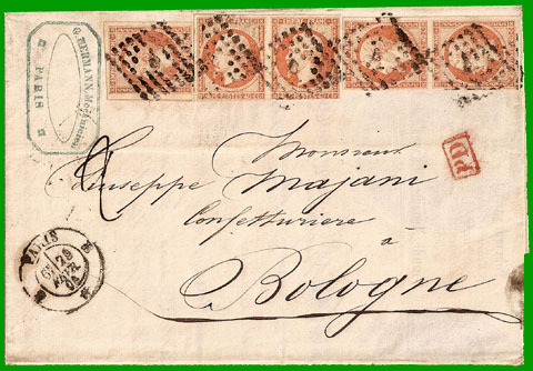 Affranchissement à 2,00 FCette lettre, postée à Paris le 25 février 1860, pesait plus de 7,5 grammes. Elle a donc été affranchie à 2 F. Elle est arrivée à Bologne, dans les États Pontificaux, le 28 février 1860.