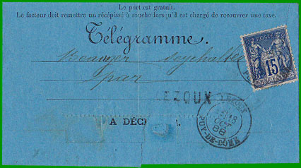 1881 Affranchissement à 15 c. Ce télégramme a été envoyé de Marseille le 18 octobre 1888, à 9 h 45 m du matin. A la demande de l'expéditeur, le bureau d'arrivée de Lezoux a employé la poste pour le livrer à son destinataire à Seychalles. |