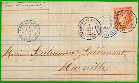 juillet 1876 Affranchissement à 40 c. Cette lettre, postée à Pointe-à-Pitre le 1 mai 1877, est entrée en France par St-Nazaire le 25 mai. Elle est arrivée à Marseille le 26 mai 1877. |