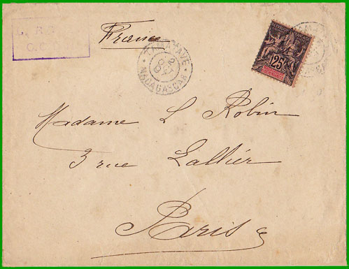 Tarif du 16 février 1879 Affranchissement à 25 c. Cette lettre, postée à Tamatave le 2 octobre 1896, est arrivée à Paris le 25 octobre 1896. |