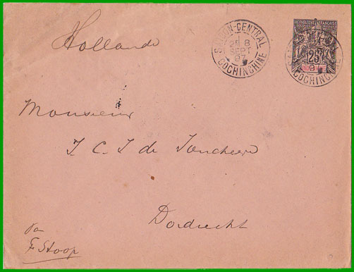 octobre 1881 Affranchissement à 25 c. Cette lettre, postée à Saigon le 8 septembre 1897, est arrivée à Dordrecht (Hollande) le 12 octobre 1897. |
