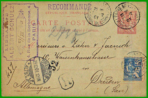 Tarif de recommandation du 16 janvier 1879 Affranchissement à 10 c. + Droit fixe 25 c. Cette carte postale de la Librairie Albert Schulz a été postée en recommandé à "Paris Tribunal de Commerce" le 27 décembre 1901, à destination de Dresde, en Allemagne. Elle est arrivée le 29 décembre 1901. |