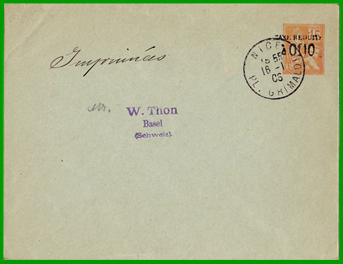 janvier 1876 Affranchissement à 10 c. Cet imprimé sous lettre a été postée à Nice le 16 janvier 1906, à destination de Basel (Bâle) en Suisse. |