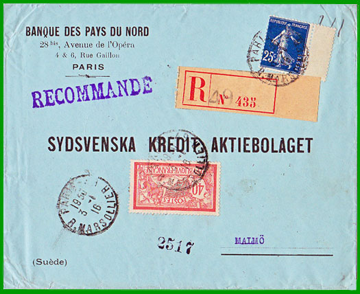 Tarif de recommandation du 16 janvier 1879 Affranchissement à 40 c. + Droit fixe 25 c. Cette lettre a été postée en recommandé à "Paris R. Marsollier" le 3 janvier 1916 à destination de Malmö, en Suède. |