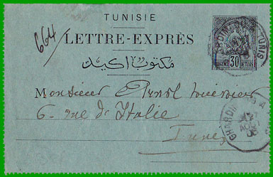 L'office tunisien a émis des timbres-poste, cartes postales simples et avec réponse payée, cartes-lettres, enveloppes timbrées, avec effigie spéciale, qui sont seuls valables dans la Régence. En conséquence, les correspondances mises à la poste en Tunisie, à partir du 1er juillet prochain, ne peuvent plus être affranchies au moyen de figurines du modèle français. Les correspondances d'origine tunisienne et de date postérieure au 30 juin 1888, qui sont revêtues de figurines françaises, sont traitées comme non affranchies d'après le tarif intérieur. Toutefois, le montant des timbres-poste français est déduit de la taxe exigible.