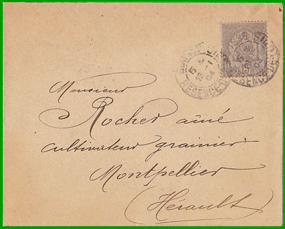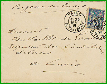 juillet 1888 Affranchissement à 15 c. Cette lettre, postée à "Paris R. Taitbout" le 23 mai 1891, est arrivée à Tunis le 27 mai 1891. |