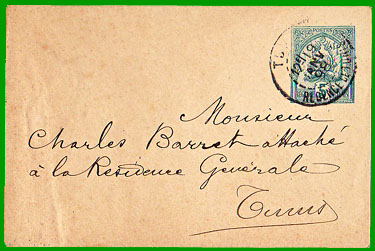 Celle-ci a été postée à Oued-Zargua le 27 août 1906. Elle a emprunté l'ambulant "Ghardimaou à Tunis" et elle est arrivée à Tunis le 27 août, où elle a été délivrée comme un télégramme.