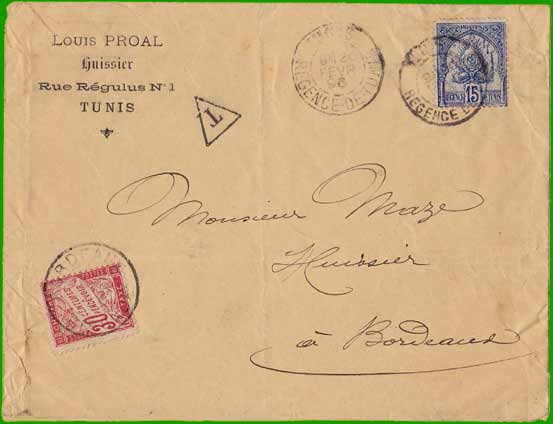 juillet 1888 et du 16 avril 1892 Affranchissement à 15 c. + Taxe 30 c. Cette lettre, postée à Tunis le 26 février 1896, pesait plus de 15 grammes. Elle a donc été taxée du double de l'insuffisance d'affranchissement, soit (30 c - 15 c) × 2 = 30 centimes, par le bureau de poste de Bordeaux. |