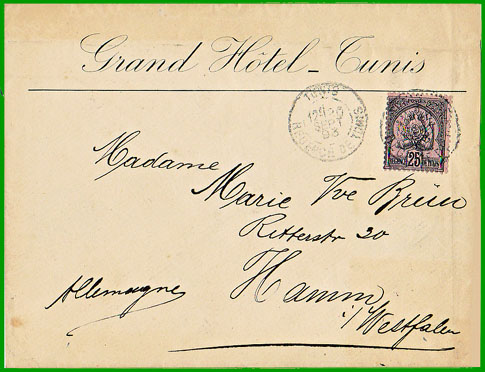 juillet 1888 Affranchissement à 15 c. Cette lettre, postée à Tunis le 20 septembre 1893, a transité par Marseille le 24 septembre. Elle est arrivée à Hamm (Allemagne) le 25 septembre 1893. |