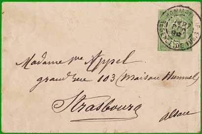 juillet 1888 Affranchissement à 5 c. Cette lettre, affranchie au tarif des imprimés sous lettre non close, a été postée à Hammam Lif le 27 décembre 1898, à destination de Strasbourg (Allemagne). |