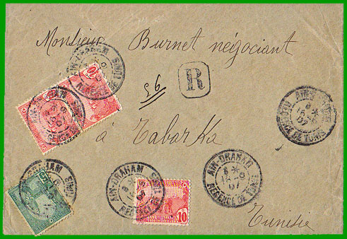 Taxe de recommandation : 25 c.Cette lettre a été postée à Ain-Draham le 16 septembre 1907, à destination de Tabarka.
