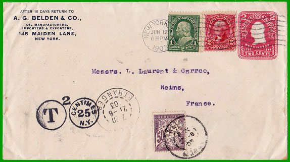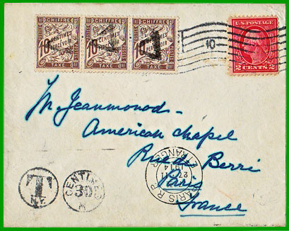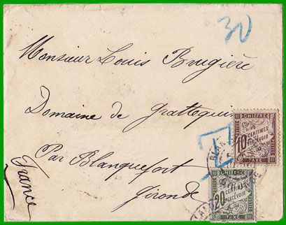 A partir du 1er octobre 1907, lorsqu'un objet est insuffisamment affranchi, le règlement de Rome prescrit au bureau expéditeur d'indiquer au moyen d'un timbre ou d'un autre procédé, en chiffres bien lisibles, apposés à côté des timbres-poste, en francs et centimes, le double du montant de l'insuffisance, c'est-à-dire la somme exacte à percevoir par le bureau destinataire. En France cette somme est arrondie à 5 centimes s'il y a lieu. |