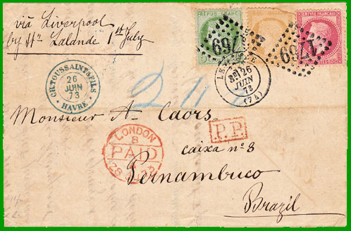 juillet 1871 Affranchissement à 1,00 F Depuis le 1er octobre 1860, La France avait une convention de poste avec le Brésil. Néanmoins, cette lettre, postée au Havre le 26 juin 1873, a emprunté la voie d'Angleterre et des bâtiment du commerce partant d'un port anglais. Elle a transité par Liverpool le 28 juin où elle a embarqué sur le steamer "Lalande" de la "Lamport & Holt Line". Elle est arrivée à Pernambuco le 29 juillet 1873. On retrouve bien l'affranchissement à 1,00 F, la griffe encadrée P.P., le cachet à date rouge "LONDON PAID", ainsi que la taxe brésilienne 240 (reis). |