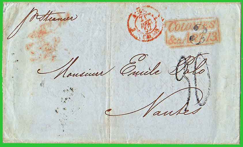 août 1849 Affranchissement à 3 reales + Taxe 30 décimes L'expéditeur de cette lettre, postée au Mexique, a payé 3 reales pour le trajet jusqu'au port d'embarquement (inscription "3"au tampon). Elle a transité par Londres le 20 décembre 1852, où l'Office des Postes britannique a apposé la marque d'échange COLONIES/&c.ART. 13. Elle est entrée en France par Calais le 21 décembre, elle a transité par Paris le 21 décembre, et elle est arrivée à Nantes le 22 décembre 1852, où le destinataire a payé la taxe de 3,00 F. |