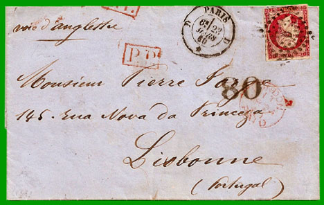 Affranchissement à 80 c.Jusqu'au 31 août 1866, La France et l'Angleterre n'eurent pas de convention postale avec le Portugal. Cette lettre, postée à Paris le 23 mars 1860, a emprunté la voie d'Angleterre pour aller à Lisbonne. On retrouve bien l'affranchissement à 80 c, la griffe encadrée