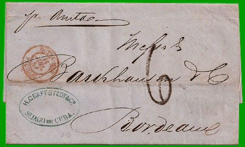 août 1849 Taxe 60 centimes Cette lettre non affranchie, postée à Santiago de Cuba, a été acheminée par le bâtiment du commerce "Anita". Elle est entrée en France par Pauillac le 11 juillet 1856 : cachet à date rouge " OUTRE-MER PAUILLAC". Elle est arrivée à Bordeaux le 11 juillet 1856 où le destinataire a payé la taxe de 6 décimes. |