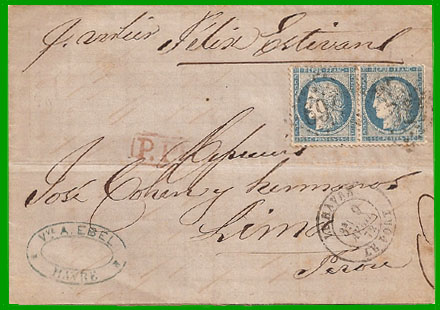 Affranchissement à 50 c.Cette lettre, postée au port du Havre le 9 avril 1872, a embarqué sur le voilier "Félix Estivant" qui l'a remise à la poste péruvienne le 7 août 1872.
