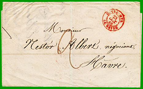 Taxe 60 centimesCette lettre non affranchie, postée à Montevideo le 23 juillet 1846, a été acheminée par un bâtiment du commerce. Elle est entrée en France par Le Havre le 23 octobre 1846 (cachet à date rouge "