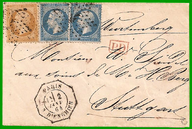 Affranchissement à 30 c. + 20 c.Cette lettre, postée le 2 janvier 1862 à destination de Stuttgart, pesant moins de 7,5 grammes, a été normalement affranchie à 30 centimes. Remise à la poste après la dernière levée, l'expéditeur a acquitté un supplément de 20 centimes pour que sa lettre parte le jour même. Elle a été prise en charge par la poste badoise le 3 janvier, et distribuée à son destinataire le 4 janvier.