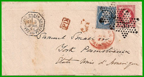 Tarif du 1er juin 1863 Taxe fixe de 20 c. Cette lettre a été postée à Paris "Ministère des Finances" le 3 avril 1868, à destination des États-Unis. L'expéditeur a payé un supplément de 20 centimes pour qu'elle parte le jour même. |