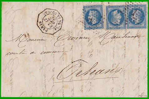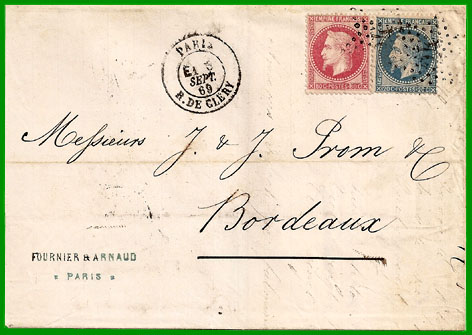 Affranchissement à 80 c. + 20 c.Cette lettre a été postée à Paris Rue de Cléry le 3 septembre 1869, après la dernière levée. L'expéditeur a payé 20 centimes en plus pour que sa lettre parte le jour même. Elle a emprunté l'ambulant "Paris à Bordeaux" du 3 septembre.